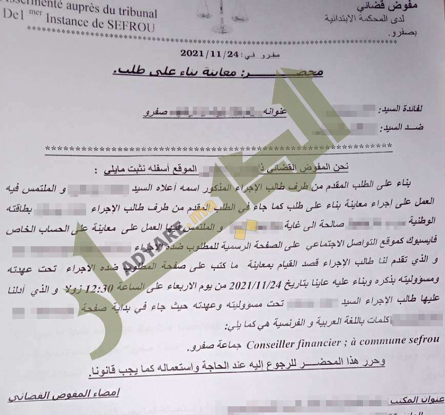 وفي هذا السياق، حصلت جريدة “الديار” على محضر معاينة، من طرف مفوض قضائي لدى المحكمة الابتدائية بصفرو، لصفحة المستشار الجماعي (م.خ) الرسمية على موقع التواصل الاجتماعي “فايسبوك”، حيث يشهد المفوض على معاينة عبارة “Conseiller financier à commune de sefrou” (مستشار مالي بجماعة صفرو).