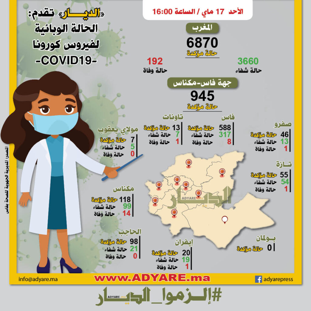 يذكر أن الحصيلة الوطنية خلال 24 ساعة الماضية (حتى الرابعة زوالا) أشارت إلى 129 حالة إصابة جديدة ليبلغ العدد الإجمالي للمصابين 6870.