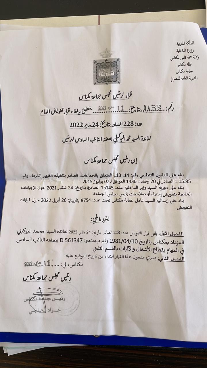 وفي هذا السياق، قام جواد باحجي، عمدة مكناس، بإلغاء تفويض محمد البوكيلي، نائبه السادس، في مهام قطاع الأشغال والآليات بالقسم التقني. حسب مراسلة نتوفر على نسخة منها (وثيقة1).كما قام بإلغاء تفويض عباس المغاري، نائبه الأول في القسم التقني (وثيقة2).