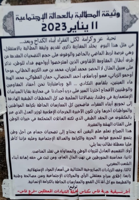 وثيقة 11 يناير 2023 للمطالبة بالعدالة الاجتماعية الموقعة من أطر تنسيقية جهة فاس مكناس لحملة الشهادات المعطلين، فرع فاس، طالبت بـ”التقسيم العادل لثروات الوطن والمساواة في تقلد المناصب”، و”محاسبة المتورطين في نهب المال العام، ومن ثبت في حقه إهانة أبناء الشعب المغربي”، و”وقف الزيادات الصاروخية المتتالية في أسعار المواد الاستهلاكية”، بالإضافة إلى “إطلاق سراح معتقلي الرأي والحراكات الاجتماعية وسن مصالحة وطنية والقطيعة مع كل أشكال القمع والممارسات الحاطة بالكرامة الإنسانية”.