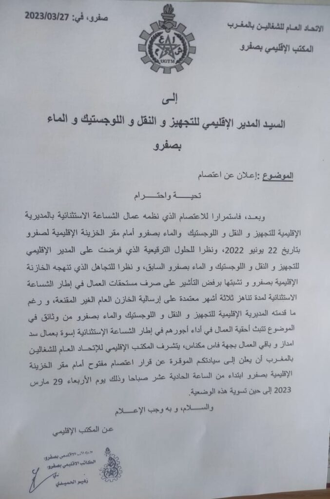 وفي إعلانه الموجه إلى المدير الإقليمي للتجهيز والنقل واللوجستيك والماء بصفرو، ذكر المكتب أنه استمرارا للاعتصام الذي نظمه عمال الشساعة الاستثنائية بالمديرية الإقليمية للتجهيز والنقل واللوجستيك والماء بصفرو أمام مقر الخزينة بتاريخ 22 يونيو 2022، ونظرا للحلول الترقيعية التي فرضت على المدير الإقليمي للتجهيز السابق، ونظرا للتجاهل المنتهج من طرف الخازنة الإقليمية بصفرو وتشبثها برفض التأشير على صرف مستحقات العمال في إطار الشساعة لمدة تناهز ثلاثة أشهر معتمدة على إرسالية الخازن العام غير المقنعة، تفيد المراسلة، توصلنا بنسخة منها.