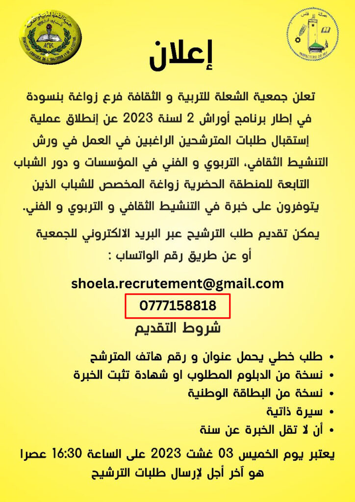 لكن اللافت أن زوجة الفاعل الجمعوي استفادت أيضا من ورش آخر لكن هذه المرة باسم جمعية الشعلة للتربية والثقافة ـ فرع زواغة، حيث أعلنت الجمعية بنفس الرقم الهاتفي، عن فتح المجال لاستقبال طلبات الراغبين في العمل في ورش التنشيط الثقافي والتربوي والفني في المؤسسات ودور الشباب التابعة للمنطقة الحضرية زواغة.