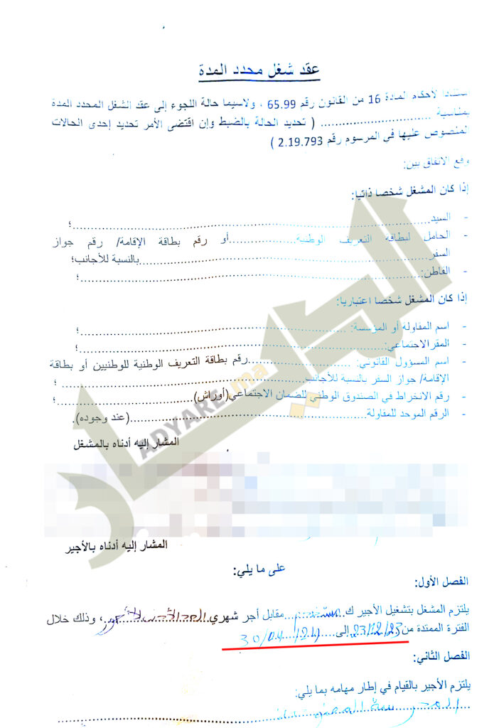 وتنص الوثيقة على أن ينجز “الأجير” عمله في المؤسسات التعليمية دون أن يتم تحديدها، مع استفادته من يوم عطلة واحد في الأسبوع مقابل “الحد الأدنى للأجور” دون أن يتم تحديد قيمة المبلغ بالأرقام.