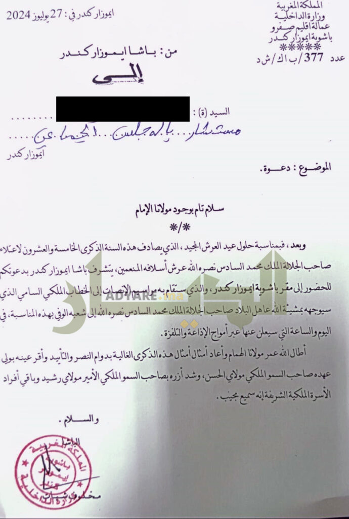وكشفت المصادر أن لخصم نظم مراسيم “خاصة به”، في بهو مقر الجماعة، مقاطعا المراسيم الرسمية المنظمة بمقر باشوية إيموزار كندر، رغم توصله بدعوة في الموضوع على غرار باقي أعضاء المجلس الجماعي.