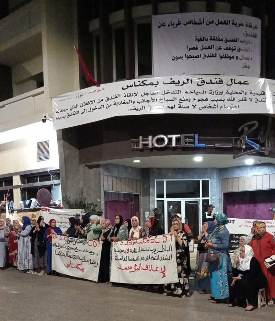 إلى ذلك، رفع عمال الفندق الذي تعتصم أمام مقره العاملات لافتة فوق باب الفندق يطالبون من خلالها السلطات الإقليمية والمحلية ووزارة السياحة بالتدخل العاجل لإنقاذ الفندق من الإغلاق الذي سيطاله بسبب ما وصفوه بالهجوم ومنع السياح الأجانب والمغاربة من الدخول إليه بسبب الاعتصام.