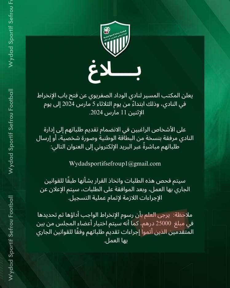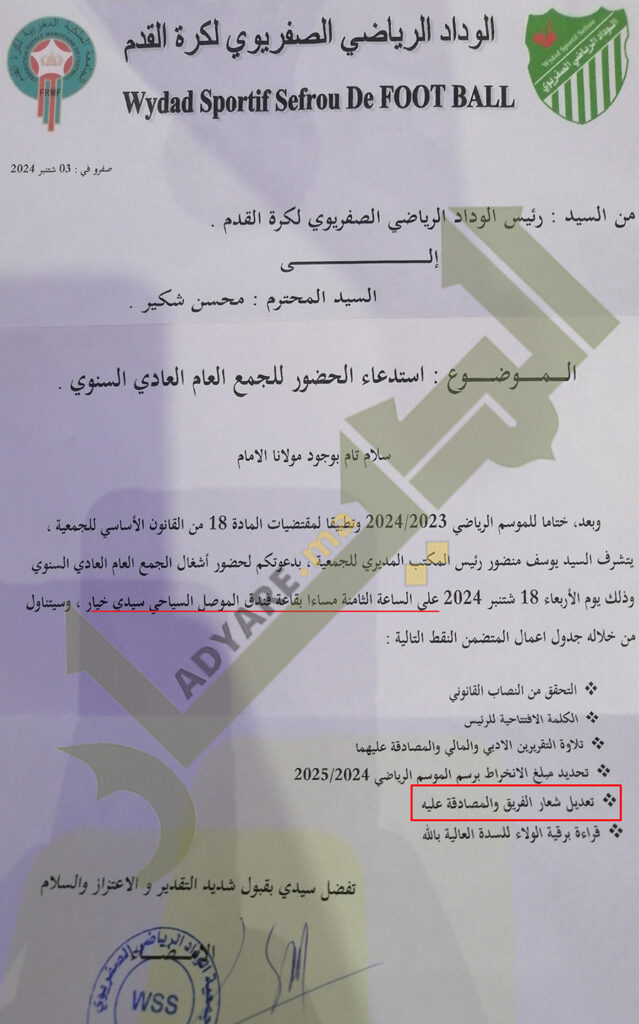 وتوصل المنخرطون بجمعية الوداد الرياضي الصفريوي باستدعاءات لحضور أشغال الجمع العام العادي السنوي يوم الأربعاء 18 شتنبر المقبل على الساعة الثامنة مساء بفندق “الموصل السياحي” بجماعة سيدي خيار، نواحي مدينة صفرو.