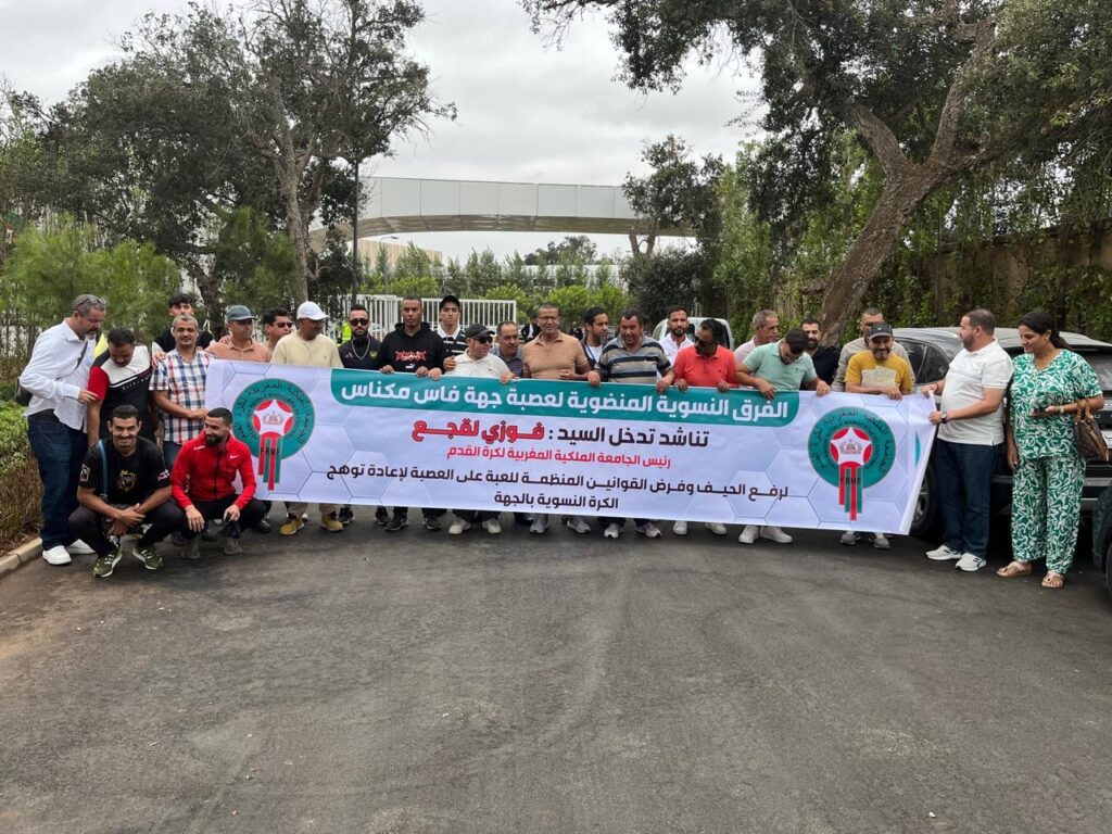 ومن خلال شعار حمله أعضاء الجمعيات، ناشدت الفرق النسوية المنضوية لعصبة جهة فاس مكناس فوزي لقجع بصفته رئيس الجامعة الملكية المغربية لكرة القدم برفع “الحيف وفرض القوانين المنظمة للعبة على العصبة لإعادة توهج الكرة النسوية بالجهة”.