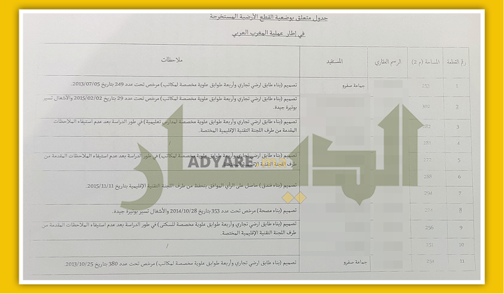 “الخروقات” لا تتوقف عند هذا الحد، وفق الوثائق التي حصلت عليها جريدة “الديار”، وحسب دفاتر التحملات الخاصة ببيع البقع الأرضية عن طريق “عروض أثمان”، بين شركة “العمران” والمستفيدين بأثمنة رمزية تقريبا، مقارنة مع سعر المتر مربع في الوقت الراهن، فإن المادة 9 منها، والمتعلقة بالجدولة الزمنية لإنجاز المشروع تنص على: “يجب على المستفيد أن يتقدم بطلب رخصة البناء في أجل أقصاه شهرين بعد تسلمه للقطعة الأرضية من طرف الشركة، والشروع في البناء في مدة أقصاها شهر واحد من تاريخ تسلم رخصة البناء”. مع الإشارة إلى أن أغلب دفاتر التحملات هاته تم توقيع أغلبها سنة 2010، ومن بين المستفدين من هذا المشروع، حسب لائحة رسمية، نجد نائب برلماني سابق (قطعتان)، ومقاول، متابع في ملف “الفساد الانتخابي” (أو ما يعرف بفضيحة “الشيكات الانتخابية) بجماعة صفرو.