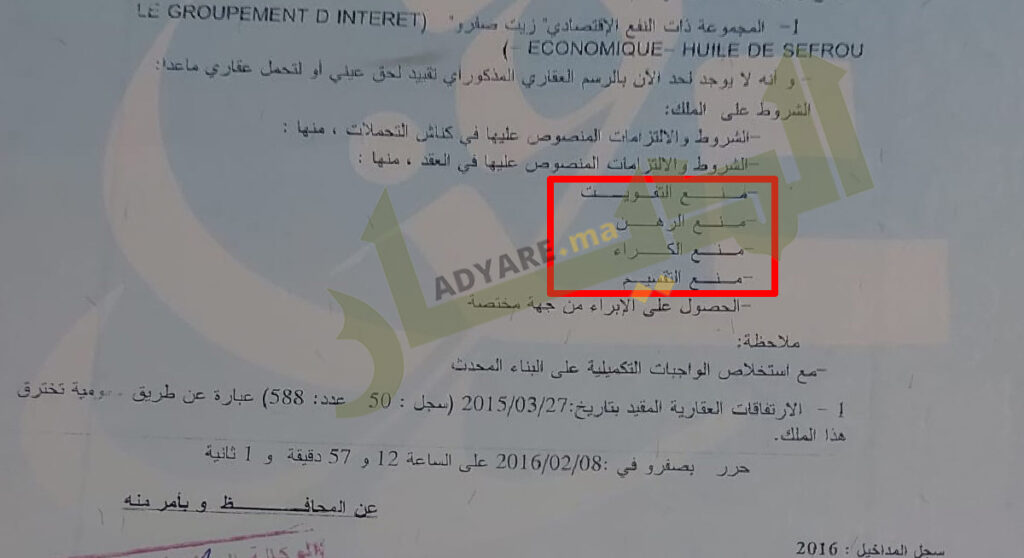 مصادر جريدة “الديار” أكدت أن لا أحد يملك الحق في تفويت أو كراء أو منح التعاونية لأي شخص أو مؤسسة، حسب القانون رقم 112-12 المتعلق بالتعاونيات، وحسب “شهادة الملكية” (الوثيقة) التي تمنع التفويت والرهن والكراء والتقسيم.
