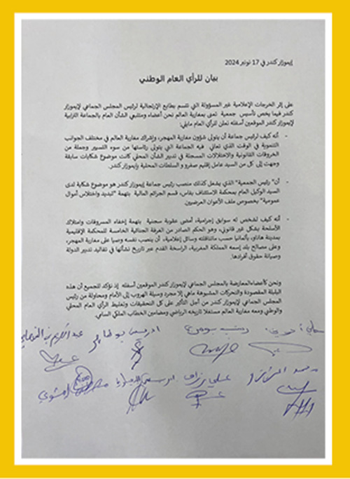 في بيان للرأي العام الوطني، عقّب أعضاء المعارضة بجماعة إيموزار كندر على الخرجات الإعلامية التي وصفوها بـ”غير المسؤولة التي تتسم بطابع الإرتجالية لرئيس المجلس الجماعي لإيموزار كندر فيما يخص تأسيس جمعية تعنى بمغاربة العالم”.