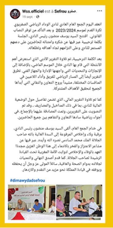 حسن أوغجي، المسير السابق والمنخرط في “الواص”، أكد تصريحات باقي المنخرطين، حيث خرج في تدوينة على صفحته “فايسبوك” أكد من خلالها أن الجمع العام لم يتطرق أبدا إلى تغيير الشعار، حيث كتب: ” بصفتي مسيرا سابقا لنادي وداد صفرو لكرة القدم وبصفتي منخرطا اشهد امام الله وامام جمهور الوداد الصفريوي اننا خلال الجمع العام الاخير لم نناقش سوى التقريرين الأدبي والمالي”.