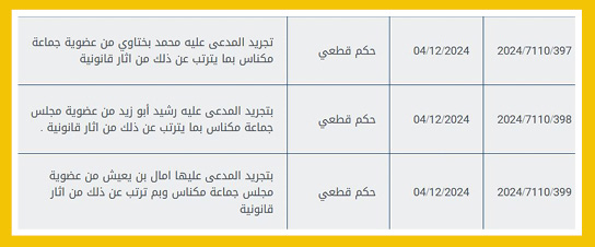 وحكمت المحكمة بتجريد كل من محمد بختاوي، النائب الأول لعمدة مكناس، وآمال بنيعيش، النائبة الثامنة لرئيس الجماعة، عن حزب “الحمامة”، بالإضافة إلى المستشار رشيد أبو زيد من عضوية مجلس جماعة مكناس بما يترتب عن ذلك من اثار قانونية.