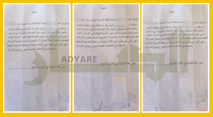 وفي السياق، حصلت جريدة “الديار” على نسخ من “إشهادات” تفضح استغلال النساء، هذه المرة، في التوقيع على عريضة ضد رئيسة جمعية للنساء بالمنزل، في الوقت الذي قدمن فيه بطائقهن للتعريف من أجل الاستفادة من الإعانات الخاصة برمضان.