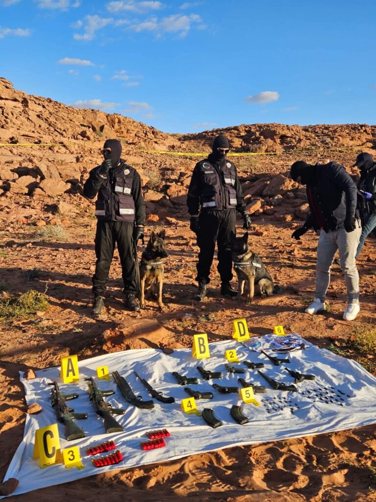 وقد مكنت عمليات التفتيش والتمشيط، التي استغرقت أكثر من ثلاث ساعات تقريبا، من العثور على شحنة من الأسلحة والذخيرة النارية مدفونة في مكان منزو أسفل المرتفع الصخري، كانت ملفوفة في أكياس بلاستيكية وجرائد ورقية منشورة بدولة مالي، من بينها أسبوعيات ورقية صادرة بتاريخ 27 يناير 2025.