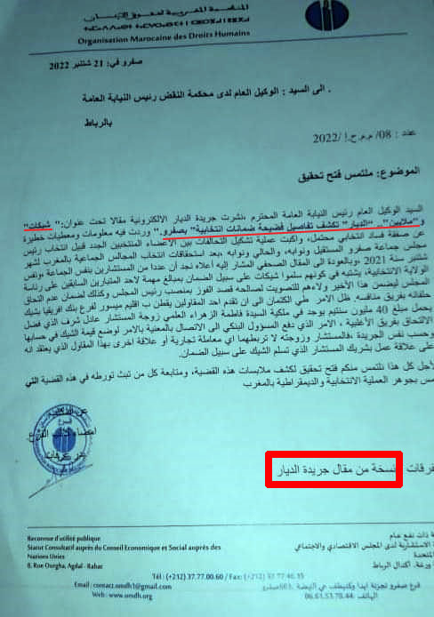 يشار إلى أن المنظمة المغربية لحقوق الإنسان بصفرو، كانت قد وجهت شكاية إلى كل من الوكيل العام بمحكمة النقض رئيس النيابة العامة، وإلى الوكيل العام بمحكمة الاستئناف بفاس مرفقة بنسخة من مقال لجريدة “الديار” تحت عنوان “شيكات” و”ملايين”.. “الديار” تكشف تفاصيل فضيحة “ضمانات انتخابية” بصفرو”، نُشر بتاريخ 29 غشت 2022، وقالت إن الأمر يتعلق بمعطيات خطيرة عن “صفقة فساد انتخابي محتمل واكبت تشكيل التحالفات بين الأعضاء المنتخبين، قبيل انتخاب رئيس جماعة صفرو المستقيل ونوابه، والحالي ونوابه”، بعد استحقاقات انتخاب المجالس الجماعية لشتنبر 2021.
