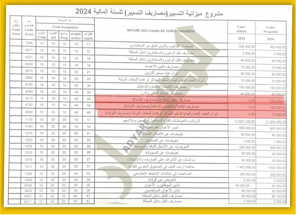 كما لم تستبعد مصادرنا أن تكون الجماعة قد تحملت مصاريف الرئيس أيضا، خصوصا أن عملية إعداد الميزانية لسنة 2024، مباشرة بعد الزيارة المثيرة للجدل، عرفت إضافة مصاريف جديدة مرتبطة بـ”مصاريف التوأمة”، حيث تم تخصيص 10 ملايين سنتيم للنقل بالخارح، و15 مليون سنتيم للإقامة والإطعام والاستقبال، ومليون سنتيم لشراء التحف الفنية والهدايا لتسليم الجوائز أو الهدايا للبعثات الدولية.