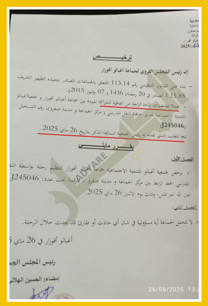 وحصلت جريدة “الديار” على نسخة من “ترخيص” يحمل توقيع رئيس الجماعة، عن حزب التجمع الوطني للأحرار، يسمح بتنظيم رحلة إلى عين الله عبر فاس، بناء على القانون التنظيمي 113-14 المتعلق بالجماعات، وبناء على المادة 4 من اتفاقية الشراكة بين جماعة أغبالو أقورار، وجمعية “أغبالو للتنمية الاجتماعية”، وكذلك بناء على طلب لرئيس الجمعية السالفة الذكر بتاريخ 26 ماي 2025.