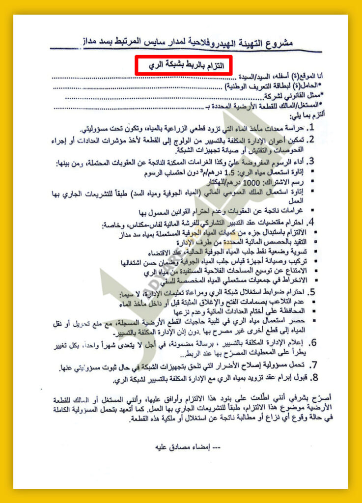 وفي السياق، وصفت فعاليات بعض البنود في وثيقة الالتزام بالربط بشبكة الري بـ”غير المقبولة” و”المجحفة” بالنسبة للفلاحين، متحدثة عن رفض عدد مهم من أصحاب الأراضي الفلاحية التوقيع عليها، وخصوصا بمناطق أولاد الطيب، والحاجب، وعين الشكاك، ومولاي يعقوب، وسيدي خيار، وأغبالو أقورار.