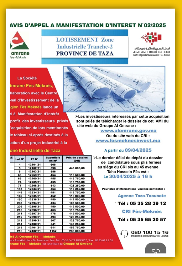 دخلت جمعية تازة للمستثمرين على خط الجدل القائم حول إلغاء طلب إبداء الاهتمام رقم 02/2025 المتعلق باقتناء البقع الأرضية بالحي الصناعي الثاني، وهو المشروع الذي أطلقته شركة العمران فاس–مكناس بشراكة مع المركز الجهوي للاستثمار بفاس–مكناس خلال شهر أبريل الماضي، قبل أن يتم توقيفه بشكل مفاجئ ودون أي توضيح رسمي.