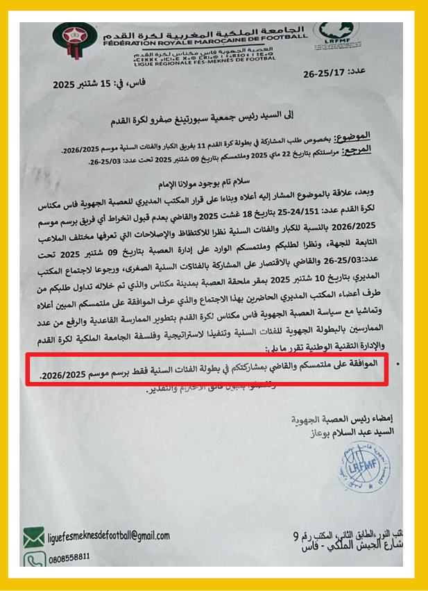 “في عهد المكتب السابق لعصبة فاس مكناس لكرة القدم تم إشراكنا بشكل قانوني في بطولة الفئات الصغرى، لكن مع هذا المكتب تم حرماننا من المشاركة بفئة الكبار، وهو ما قبلناه، على مضض، بدعوى الاكتظاظ وقلة الملاعب رغم توفرنا على جميع التراخيص”، يشرح حموني، قبل أن يضيف أن العصبة قررت الاقتصار على مشاركتنا بالفئات الصغرى، حيث نتوفر على قرار رسمي، موقع من طرف رئيس العصبة عبد السلام بوعاز، (الوثيقة).