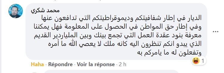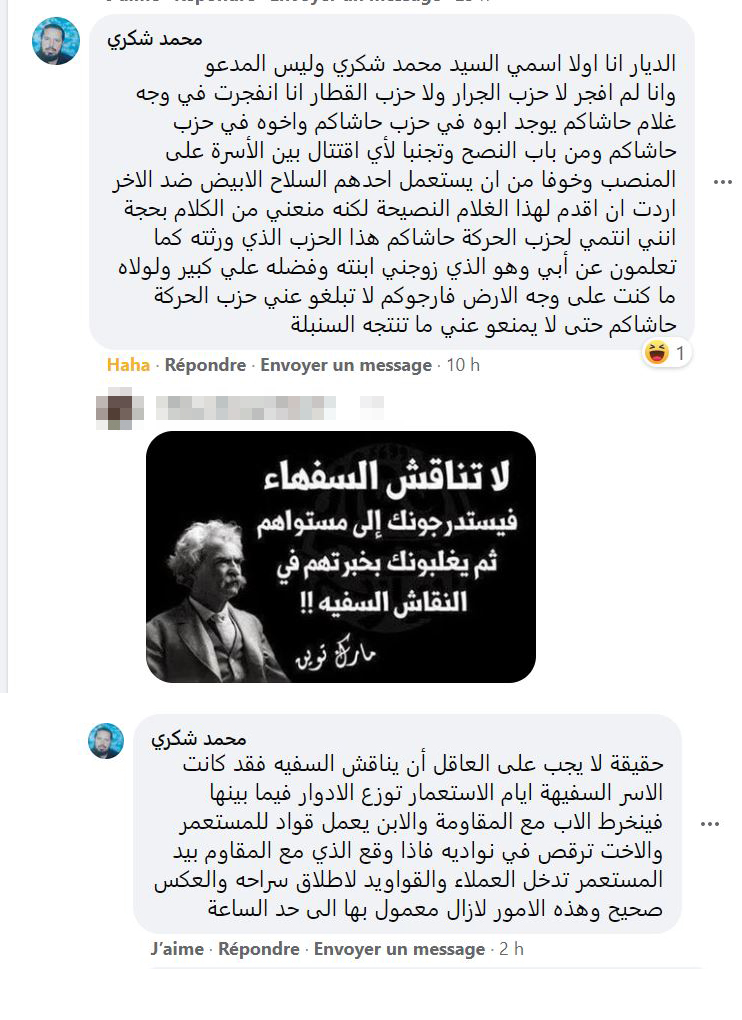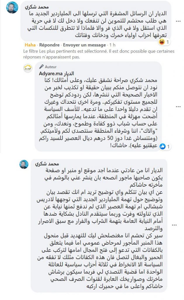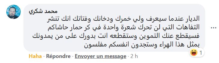 تعليقات “المدعو”، التي لا تناسب سنه، يا حسرة – ننشرها كاملة مع الاعتذار، عن الكلام الساقط، لقرائنا المحترمين – حبلى بـ”المؤخرات” و”القوادة” وكلام “الزنقة” والقذف في الأعراض، سواء في حق صحافيي الجريدة أو في حق مناضلين اختاروا “النزول” من “التراكتور”، ناهيك عن “اتهام” صحافيي “الديار” بشرب الخمر والتدخين، رغم أنه لا يعرفهم معرفة شخصية.