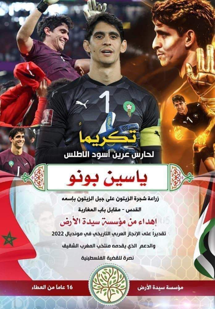 في مبادرة تكريمية للحارس الدولي المغربي ياسين بونو، الذي تألق رفقة زملائه في نهائيات كأس العالم، قررت مؤسسة “سيدة الأرض” الفلسطينية، غرس شجرة زيتون على جبل الزيتون بالقدس مقابل باب المغاربة، باسم حارس عرين منتخب الأسود.