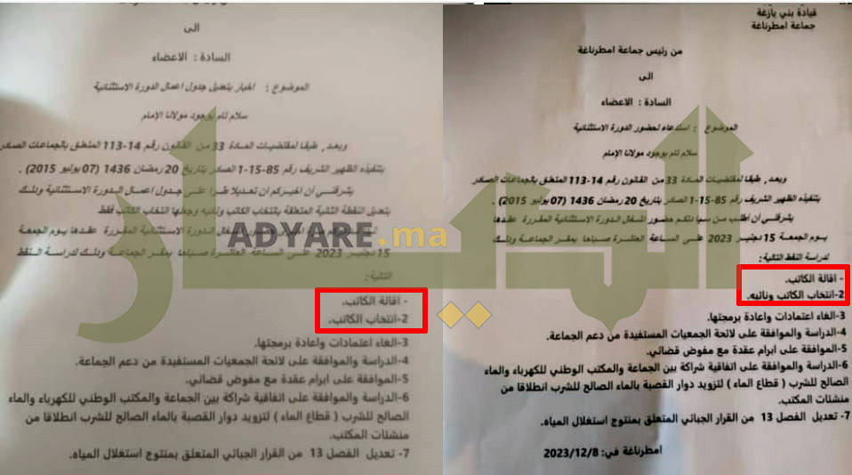 إلى ذلك، وفي السياق ذاته، حصلت جريدة “الديار” على نسختين من جدول اعمال الدورة الاستثنائية لـ15 دجنبر الماضي لمجلس جماعة امطرناغة، والتي تتضمن النسخة الأولى منهما على نقطة “إقالة” الكاتب ونائبه، قبل أن يتم تعديلها، في ظروف غامضة، إلى “إقالة” الكاتب فقط، حيث أكدت مصادر مطلعة أنه تم توجيه شكاية في موضوع “إقالة” كاتب المجلس إلى المحكمة الإدارية للبث في قانونيتها.