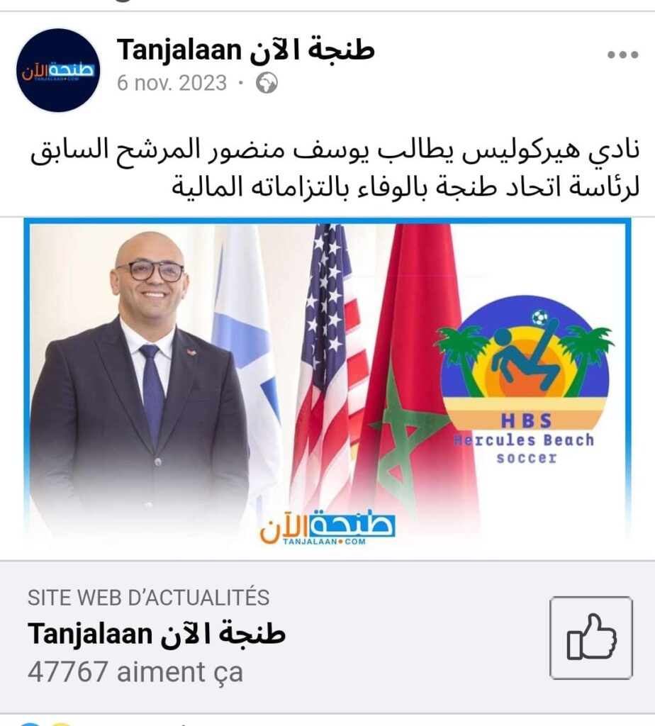 يشار إلى أن مواقع إعلامية سبق أن تحدثت عن عدم وفاء يوسف منضور بالتزاماته المالية اتجاه فريق “هيركوليس”، ممثل مدينة طنجة في رياضة كرة القدم الشاطئية: