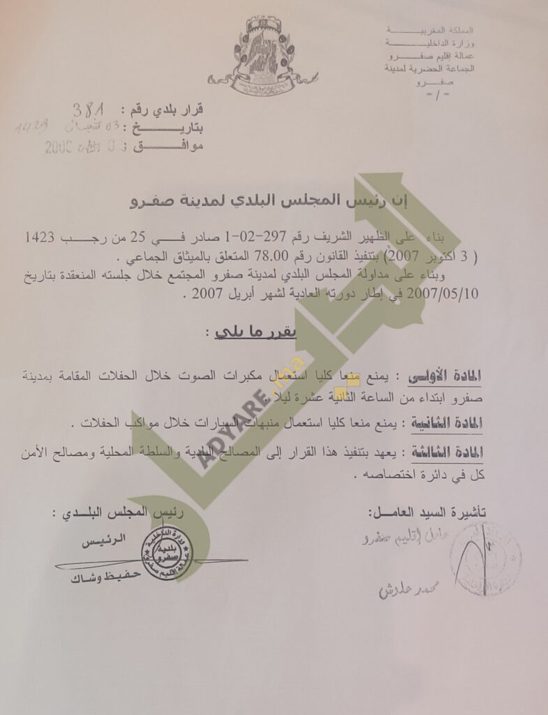 وحصلت جريدة “الديار” على نسخة من القرار البلدي رقم 381، والذي تمت المصادقة عليه من طرف مصالح العمالة قبل سنوات عديدة، بناء على مداولة للمجلس البلدي لمدينة صفرو، والذي ينص على المنع الكلي لاستعمال مكبرات الصوت خلال الحفلات المقامة بمدينة صفرو ابتداء من الساعة 12 ليلا. كما يمنع القرار منعا كليا استعمال منبهات السيارات خلال مواكب الحفلات.