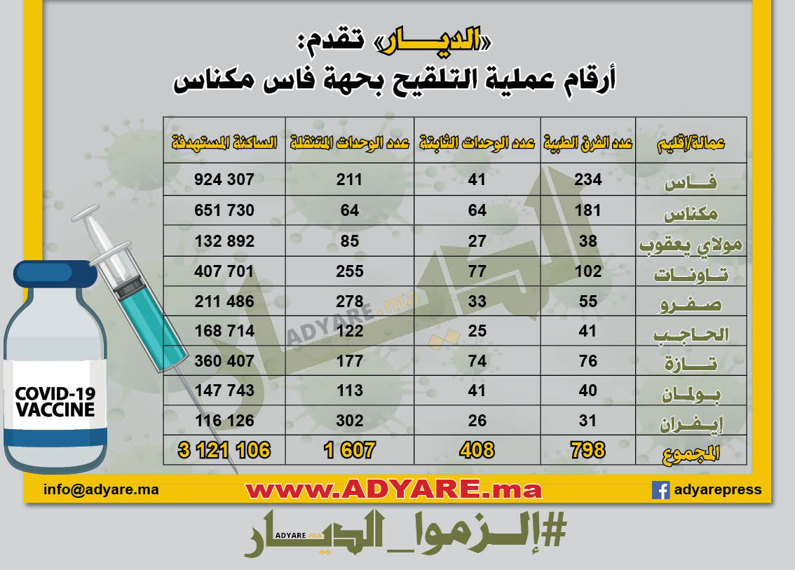 وفي هذا الإطار، قدم مصدر مطلع لجريدة “الديار” المعطيات والأرقام الخاصة بحملة التلقيح بجهة فاس مكناس.