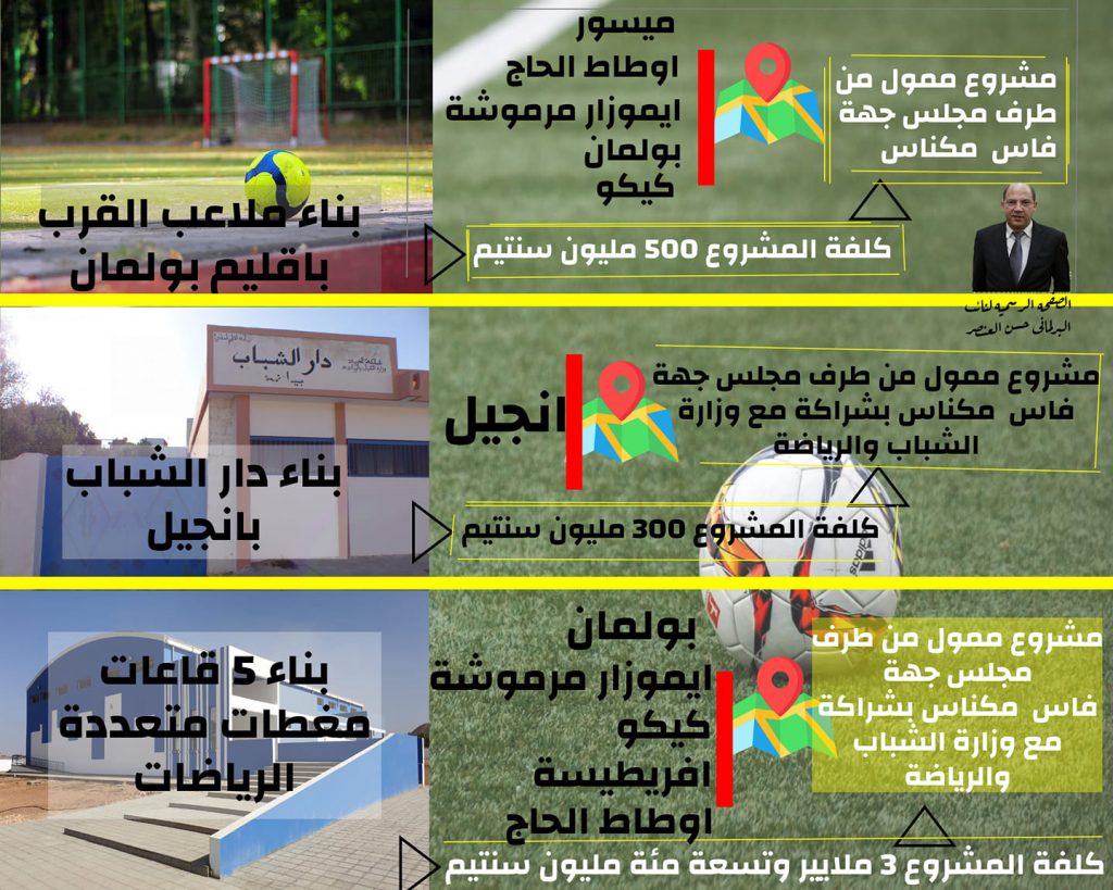 ونشر العنصر الابن، اليوم، على صفحته الرسمية في “فايسبوك” صورة لمشاريع ممولة من طرف مجلس جهة فاس مكناس، التي يرأسها والده امحند العنصر.