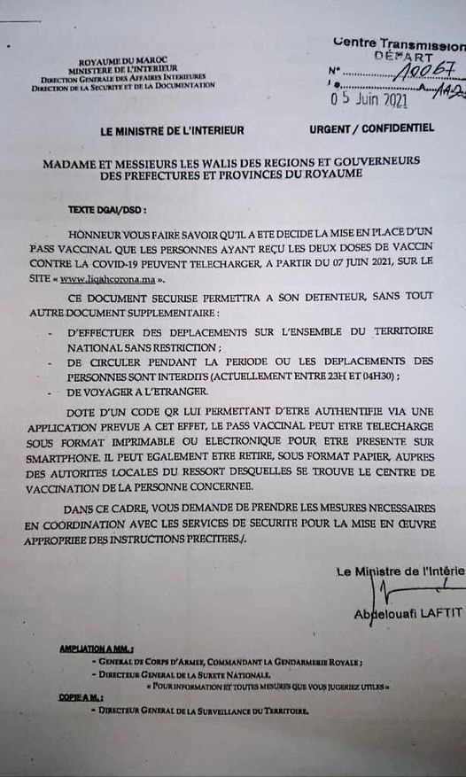 وفي السياق ذاته، نصت مراسلة لوزير الداخلية، بتاريخ 5 يونيو، إلى ولاة الجهات وعمال العمالات والأقاليم (الوثيقة) على السماح لحاملي “جواز التلقيح” بالتنقل بين الساعة 11 ليلا والساعة 4:30 صباحا.